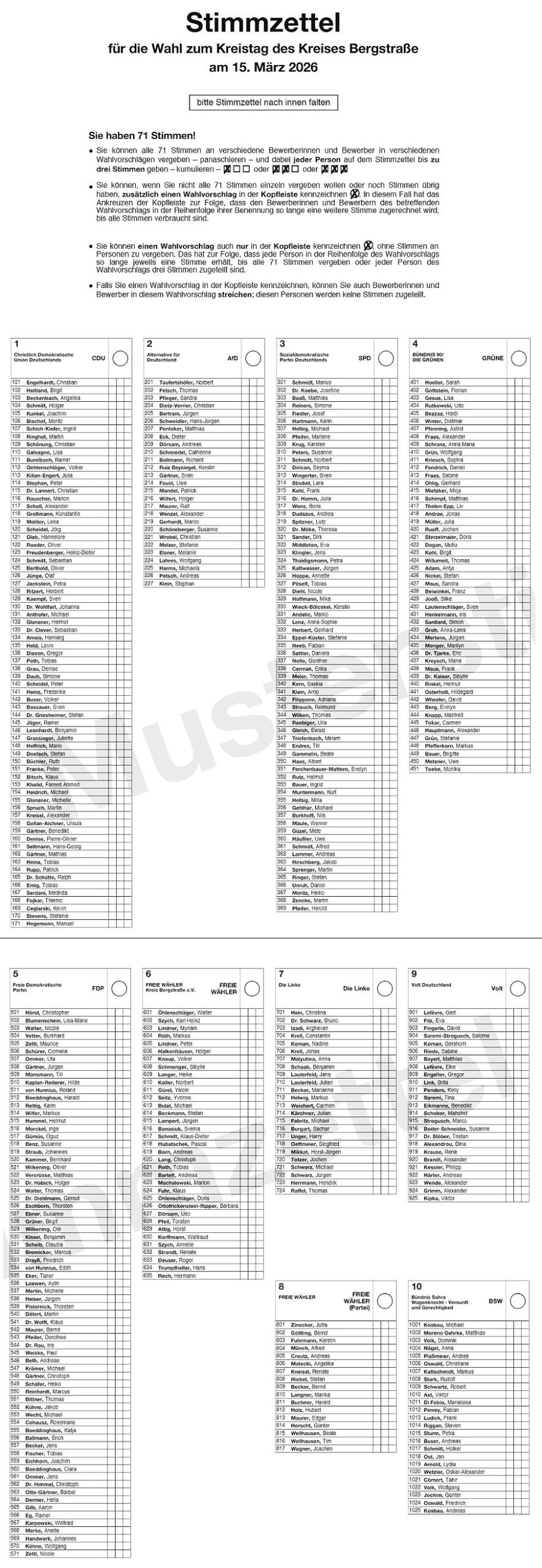 Muster Kreistagswahlzettel im Langformat